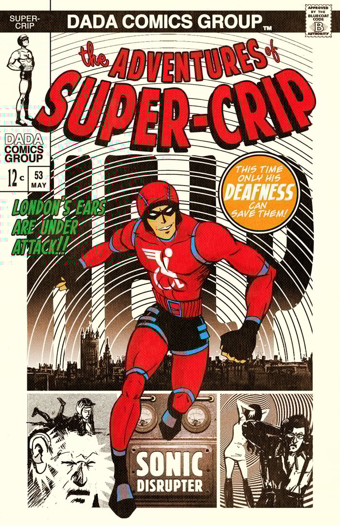 In 2012 I worked with disabled writer/comedian Laurence Clark for DaDaFest to realise his vision of his disabled superhero; SUPER-CRIP. By using his power to switch impairments at will Super-Crip gains super-increases in all other areas to compensate. By turning himself blind he gains SUPER HEARING to navigate in the dark, thus confronting common stereotypes of the disabled in popular media.